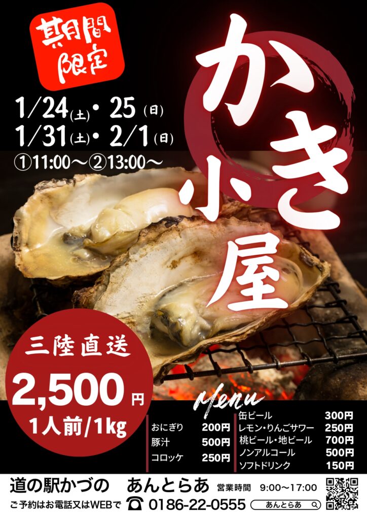 【予約受付中!!】かき小屋2026 開催のお知らせ 投稿者: 道の駅かづの2025年12月31日2025年12月31日お知らせ 今年もやります!かき小屋あんとらあ 1月・2月の4日間限定で「かき小屋あんとらあ」を開店します!三陸直送のプリプリでミルキーな牡蠣をその場で焼いてお召し上がりいただけます。スタッフが焼き方のコツをお伝えするので、かき小屋初心者さんも大歓迎!当日はあったかい豚汁やおにぎり、コロッケ、各種ドリンクの販売もあります。事前予約受付中!ぜひご家族やご友人と一緒にお越しください。※事前予約がおすすめです。当日は空きがある場合に限り先着順でご案内いたします。【開催日】2026年1月24日(土)・25日(日)・31日(土)・2月1日(日)【時間】各日2部入替制 ①11:00〜/②13:00〜【会場】道の駅かづの あんとらあ 回廊(秋田県鹿角市花輪字新田町11-4)【料金】1人前2,500円(税込/牡蠣 約7〜8個)※現金のみ【申込み】WEBまたはお電話にて◎WEB https://forms.gle/qqgxoh38b37N7jVU9◎電話 道の駅かづの あんとらあ TEL 0186-22-0555(9〜17時)【注意事項】会場は屋外のため防寒対策をしてお越しください。 ダウンロード(PDF)