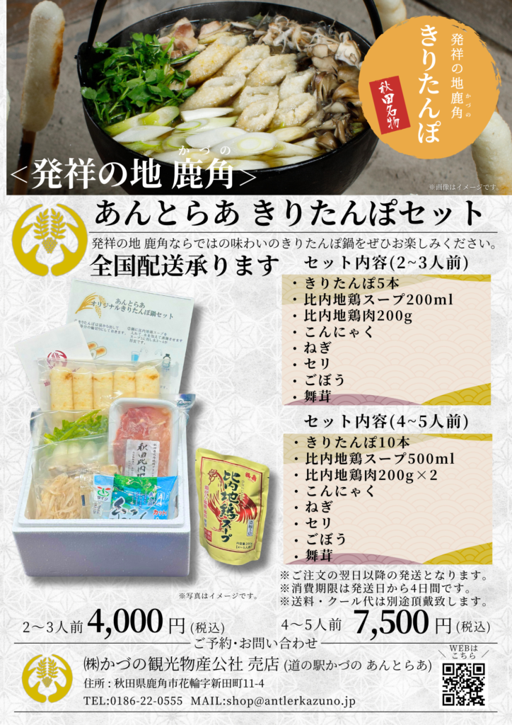 【全国発送承り中】道の駅かづの きりたんぽセット 投稿者: 道の駅かづの2025年7月23日2026年2月15日お知らせ 発祥の地の味をご家庭へお届けいたします 秋田名物「きりたんぽ鍋」をご家庭でかんたんに楽しめる「きりたんぽセット」を販売しております。秋田県産のお米・あきたこまち100%の「たんぽ」と日本三大地鶏である比内地鶏の旨味たっぷりのスープ、セリなど定番の具材をセットに、ご家庭で本格的な味わいをお楽しみいただけます。贈り物にもおすすめです。ぜひご賞味ください。【商品】①きりたんぽセット2~3人前:税込4,000円②きりたんぽセット4~5人前:税込7,500円※送料・クール代を別途頂戴いたします。【ご案内】◇消費期限は発送日から4日間となります。◇ご注文の翌日以降に発送いたします。◇ヤマト運輸にて発送いたします。◇お急ぎの方はお電話または店頭にてご注文ください。◇銀行振込の場合はご入金の確認が取れ次第ご注文が確定いたします。◇クレジット決済、コンビニ決済をご希望の場合は「鹿角いいね!直売所」をご利用ください。【お申込み先】道の駅かづの あんとらあ 売店①TEL 0186-22-0555(9~18時)②FAX 0186-22-0222③MAIL shop@antlerkazuno.jp★注文書または以下の項目をお知らせのうえご注文ください。注文書はこちらをクリック(PDF)メールの場合は以下コピー推奨―――――――――――――【ご氏名】 【ご住所】 (例:〒012-3456 秋田県鹿角市〇〇町1-2-3)【電話番号】 【お届け先】氏名:郵便番号:住所:電話番号:【ご希望の商品名・数量】 (例:きりたんぽセット4-5人前 × 2個)【お支払い方法】 (例:銀行振込/現金書留/代引き など)【配送希望日時】 (例:〇月〇日 午前中希望)【その他ご要望・備考】 (例:領収書の発行希望、熨斗希望など) ダウンロードはこちら(PDF)