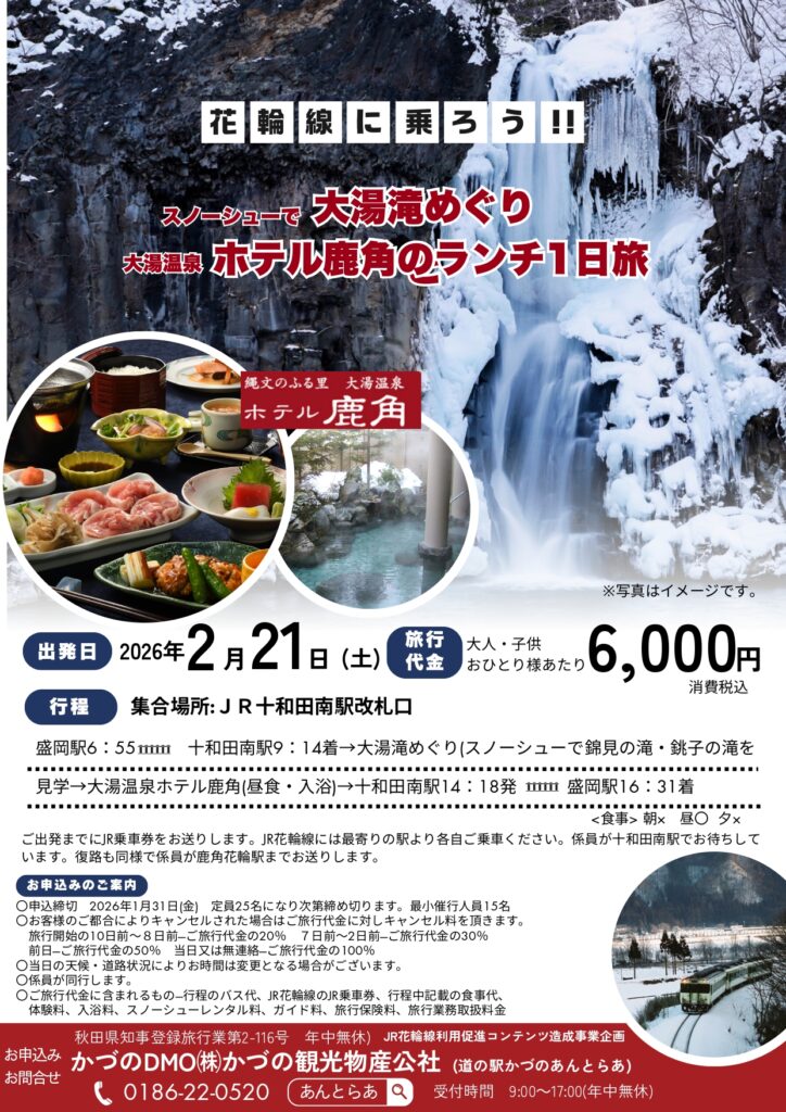 【1/10(土)9時 受付開始】2/21(土) 花輪線に乗ろう!スノーシューで大湯滝めぐり&ホテル鹿角のランチ1日旅 投稿者: 道の駅かづの2026年1月8日2026年1月8日お知らせ 1/10(土)9:00申込受付開始! 2/21(土)、JR花輪線と大湯エリアを満喫する盛岡駅発着日帰りツアーを実施いたします。今回のツアーは大湯エリアを満喫!スノーシューを履いて錦見の滝&銚子の滝を散策するほか、大湯温泉郷の老舗ホテル「ホテル鹿角」でランチと入浴をお楽しみいただけます。冬にしか出逢えない絶景と温泉を楽しもう!ぜひツアーへご参加ください!